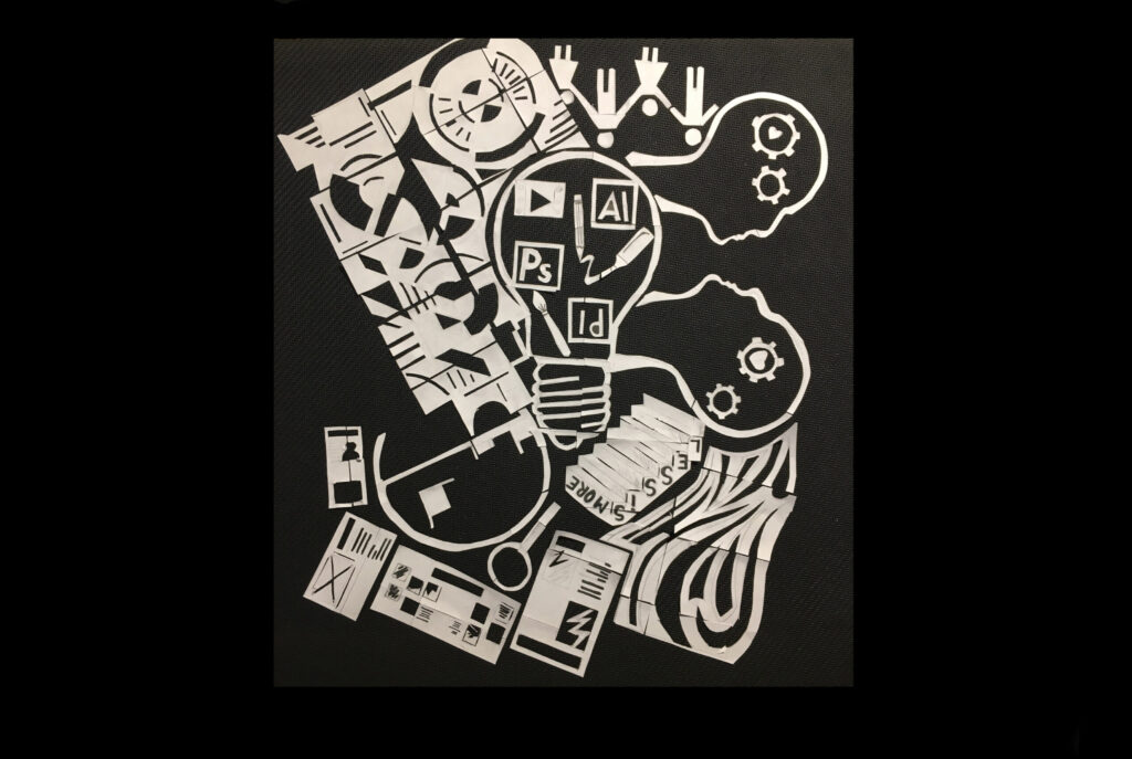 The subjects I included are, the analog and digital “work” tools, which allow me to implement my ideas; the profiles of two people and the stylized little men, stand for a personal aspect, that is, when I design I try to create interaction between the ‘object or designer and people. The geometric motif and the Bauhaus seal, relate to the choice of cleanliness, linearity and simplicity that I always look for in every project. At the bottom, I tried to synthesize, what for me is research, experimentation, even questioning things that already exist; the scale on the other hand, represents the continuous progress and change of the world and people, to which we have to “keep up.” Finally, the free pattern, represents the component of naturalness, expressive and forms.