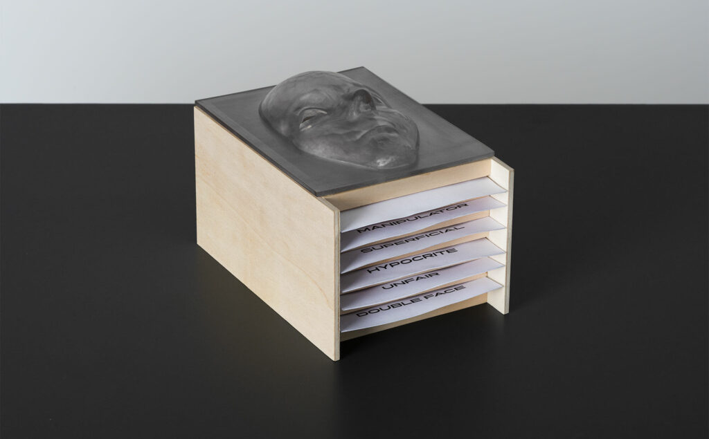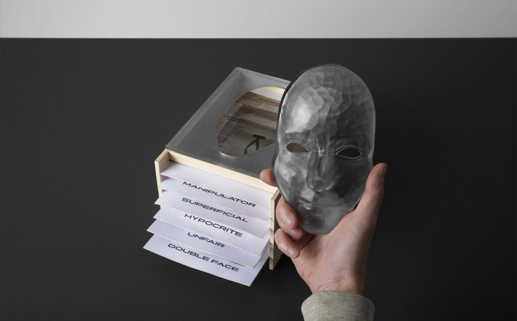 Questo dispositivo permette all’utente di interfacciarsi con il suo “io” più profondo, liberandolo progressivamente dai filtri che ci impone la società ogni giorno attraverso i social-media e le relazioni interpersonali: questi sono rappresentati dalla maschera posta al di sopra della scatola, la quale è suddivisa lateralmente da layer, che sfilati uno ad uno accompagnano l’utente in una discesa progressiva fino ad arrivare alla sola e pura immagine riflessa, data dallo specchio posto sul fondo.