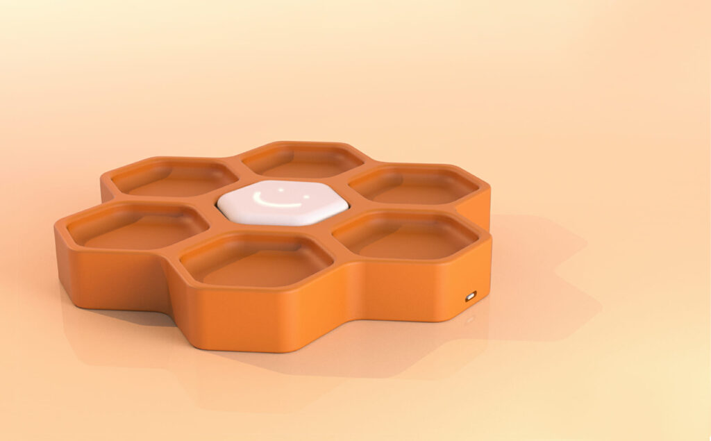 Smile è composto da tre oggetti: un dispositivo per il docente che segnala l’eventuale lontananza di un bambino, uno per lo studente collegato al primo e il caricatore.