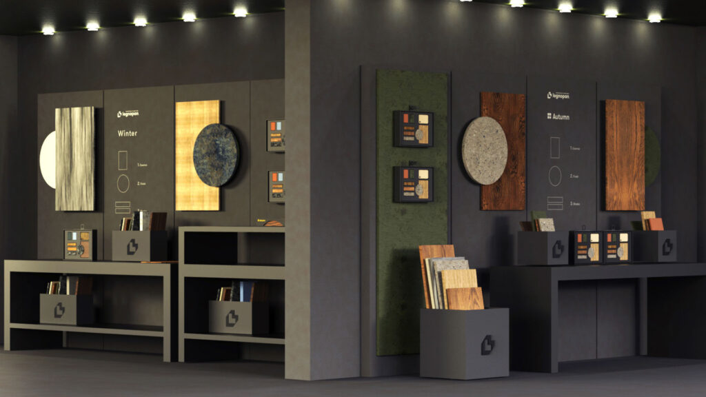 Nella seconda proposta viene utilizzato un linguaggio più evocativo ed emozionale. Nei supporti cartacei si è tradotto con una specifica scelta organizzativa dei contenuti separando informazioni testuali e tecniche da quelle visuali e proponendo dei format fotografici come moodboard e rendering ambientati. Nei corner espositivi è stata utilizzata una disposizione spaziale che alludesse più al concetto di mostra artistica, rispetto a quella che abitualmente si vede per i punti vendita standard.