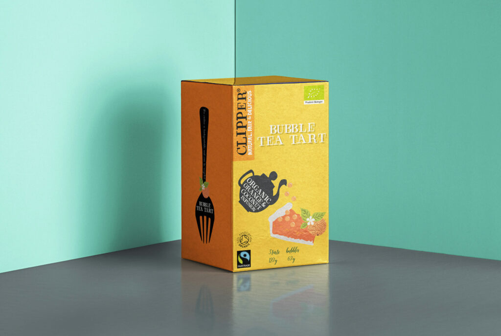 Dalla concezione base di Clipper Teas, il packaging di Bubble Tea Tart nasce come elemento che cerca di essere il più possibile “Natural and Fair”. Per questo motivo il pack è compposto di tre soli elementi: un involucro in PLA (plastica riciclabile) per le crostatine, un vasetto di vetro dedicato alle bubble e una scatola di cartone a ricordo di quelle classiche per il tè.