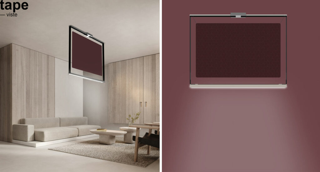 Un pannello in feltro fonoassorbente ricavato dal PET riciclato, si illumina mostrando i disegni superficiali. L’alimentazione deriva da un filo ricoperto in tessuto che poi diventa l’orlo che caratterizza il taglio orizzontale in corrispondenza con la sorgente luminosa.